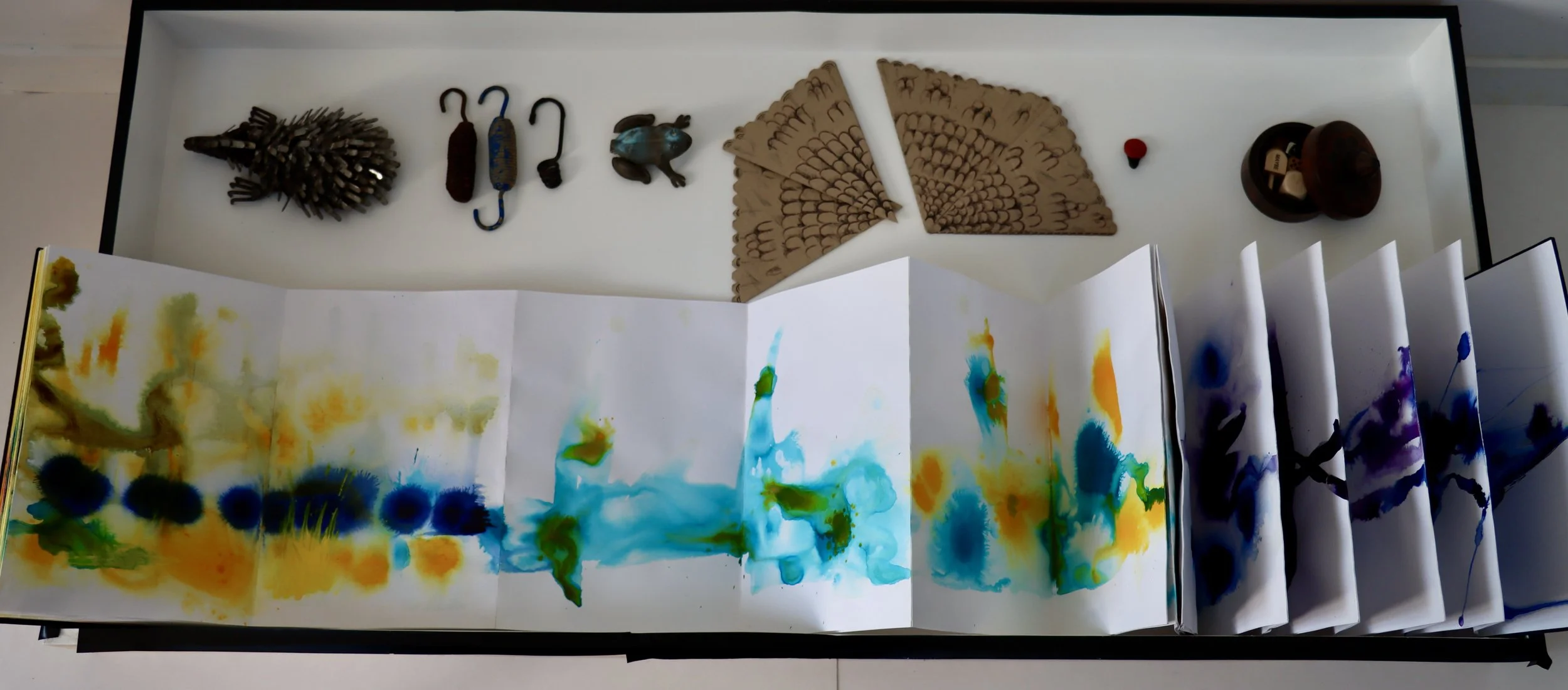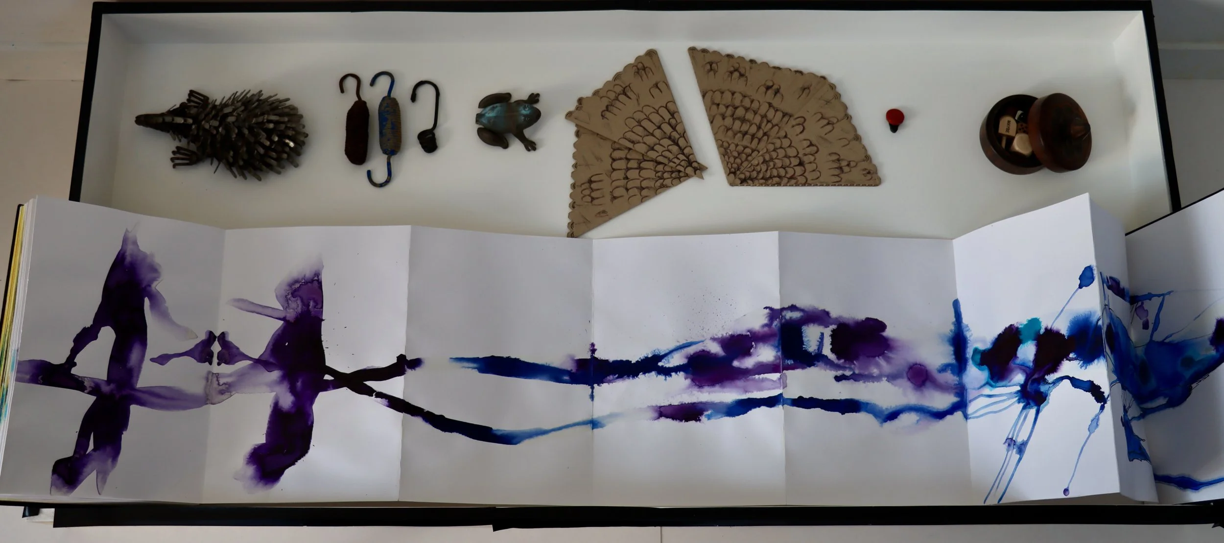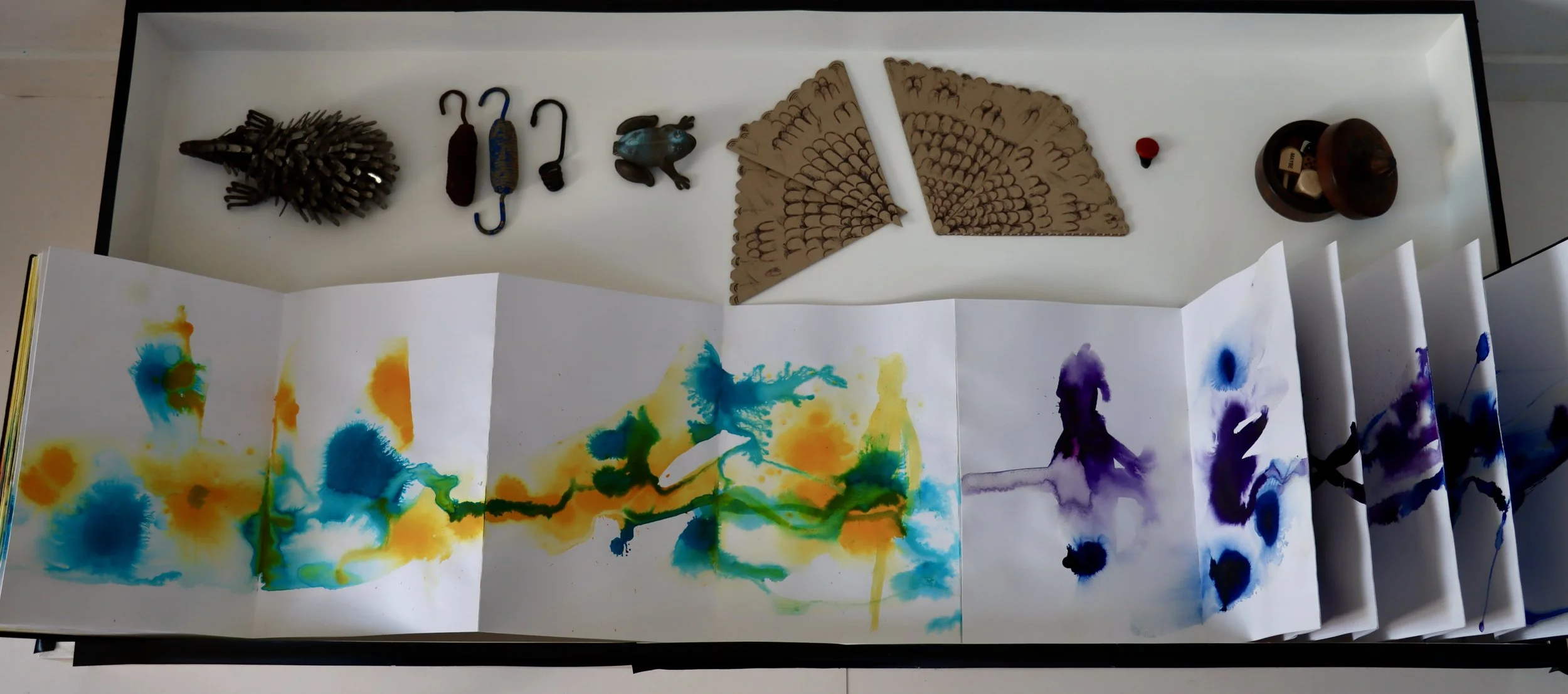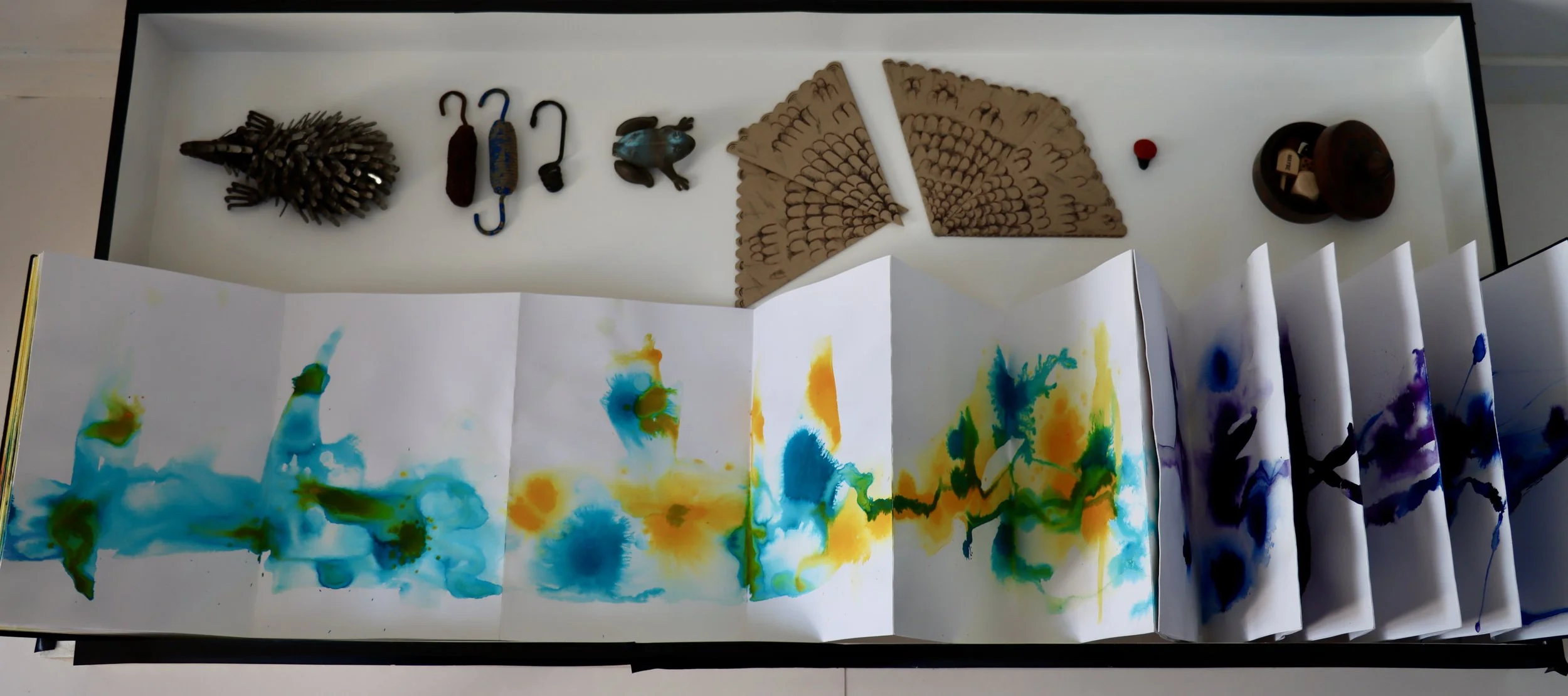 Vas Hermeticum: Between the Imaginal and the Real brings together a concertina sketchbook and a constellation of found objects within an intimate, contained display. The concertina, one of six developed in the last 2 years, operates as a site of psychic encounter, where painting, staining, and mark-making become processes of dialogic engagement with emerging imagery. Informed by alchemical thinking, the sketchbook functions as a vas Hermeticum—a sealed vessel in which traces of the psyche form and unfold through material practice, reflective attention, and the dynamics of projectio.