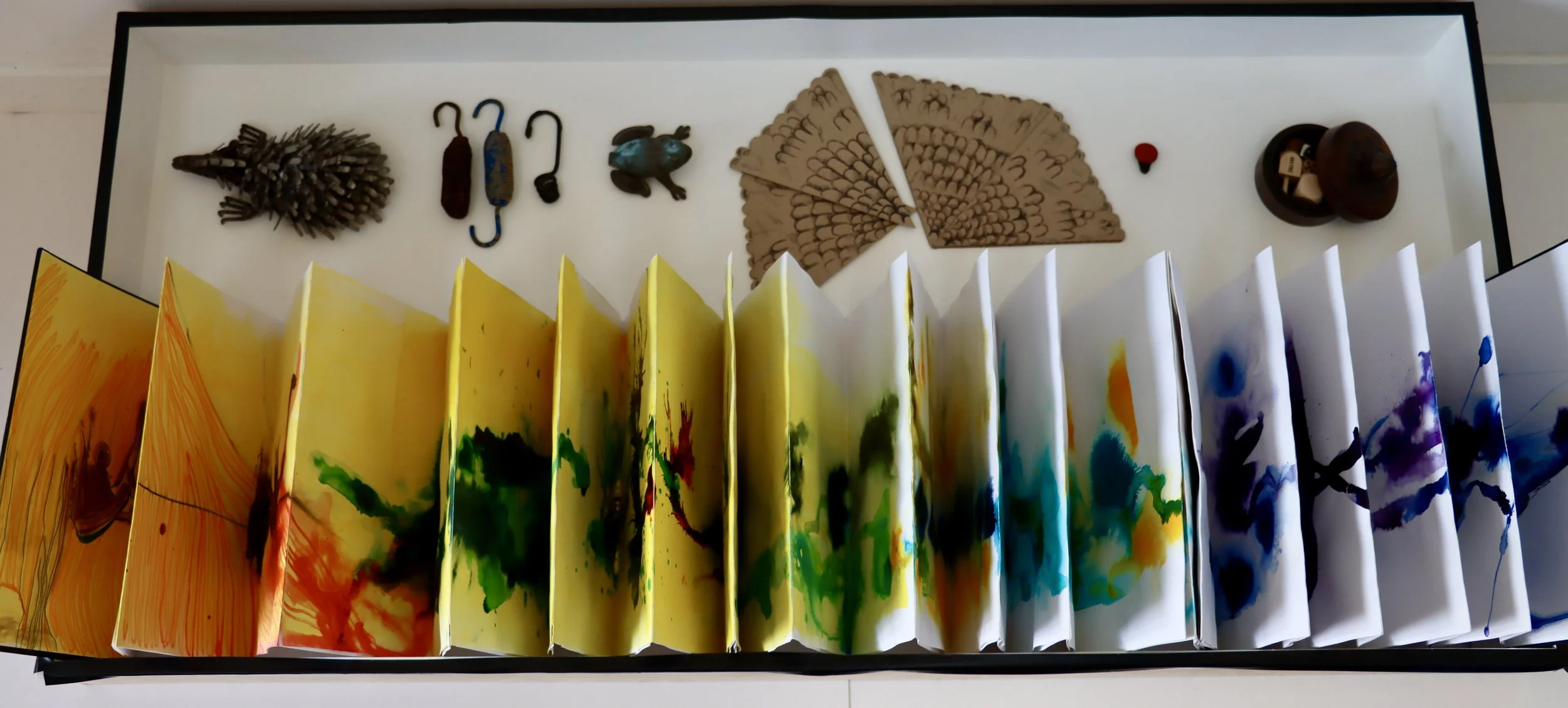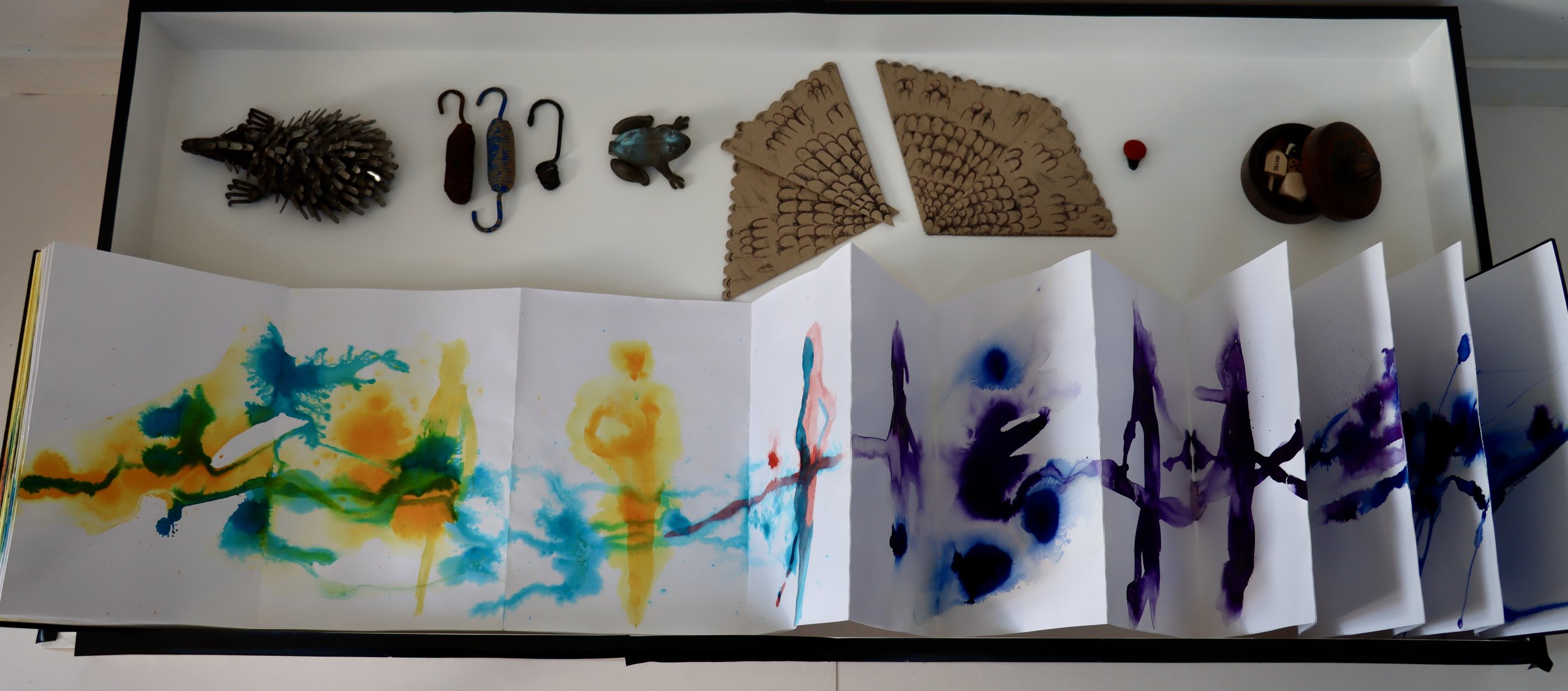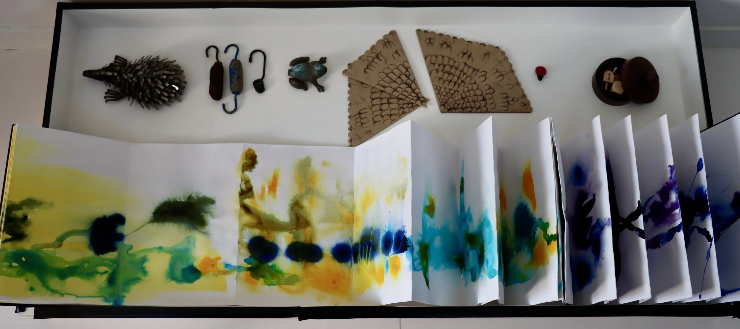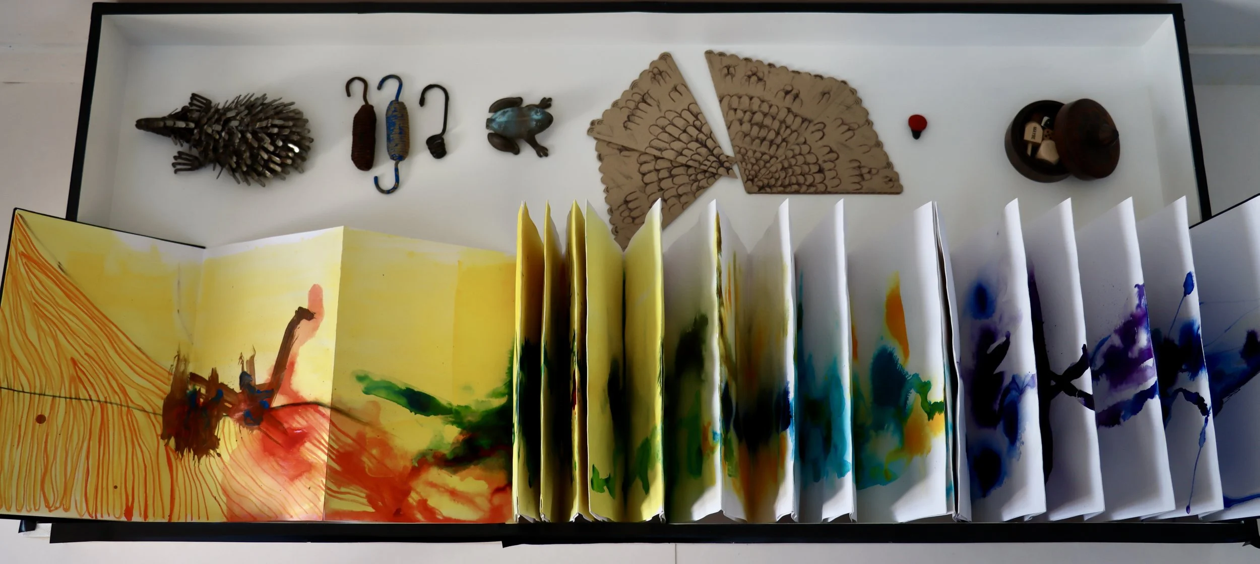 Vas Hermeticum: Between the Imaginal and the Real brings together a concertina sketchbook and a constellation of found objects within an intimate, contained display. The concertina, one of six developed in the last 2 years, operates as a site of psychic encounter, where painting, staining, and mark-making become processes of dialogic engagement with emerging imagery. Informed by alchemical thinking, the sketchbook functions as a vas Hermeticum—a sealed vessel in which traces of the psyche form and unfold through material practice, reflective attention, and the dynamics of projectio.