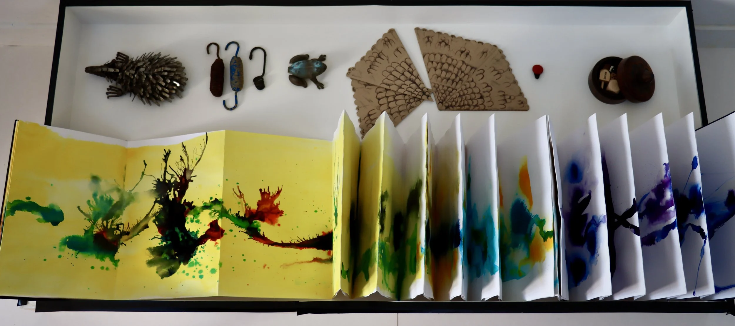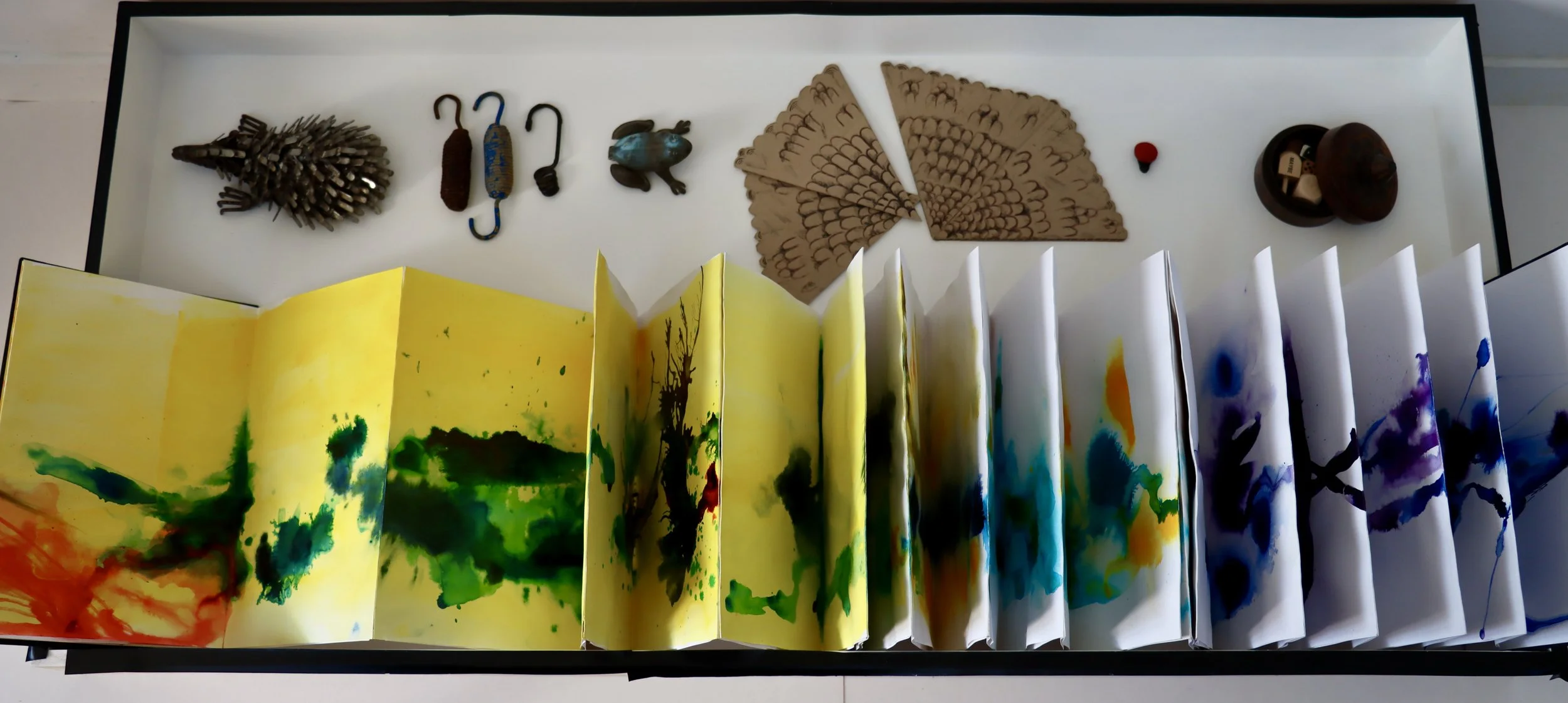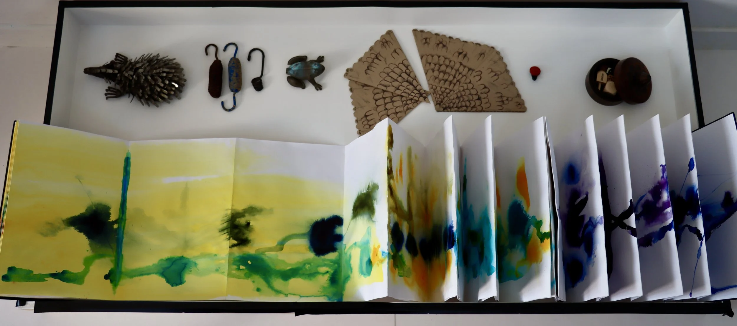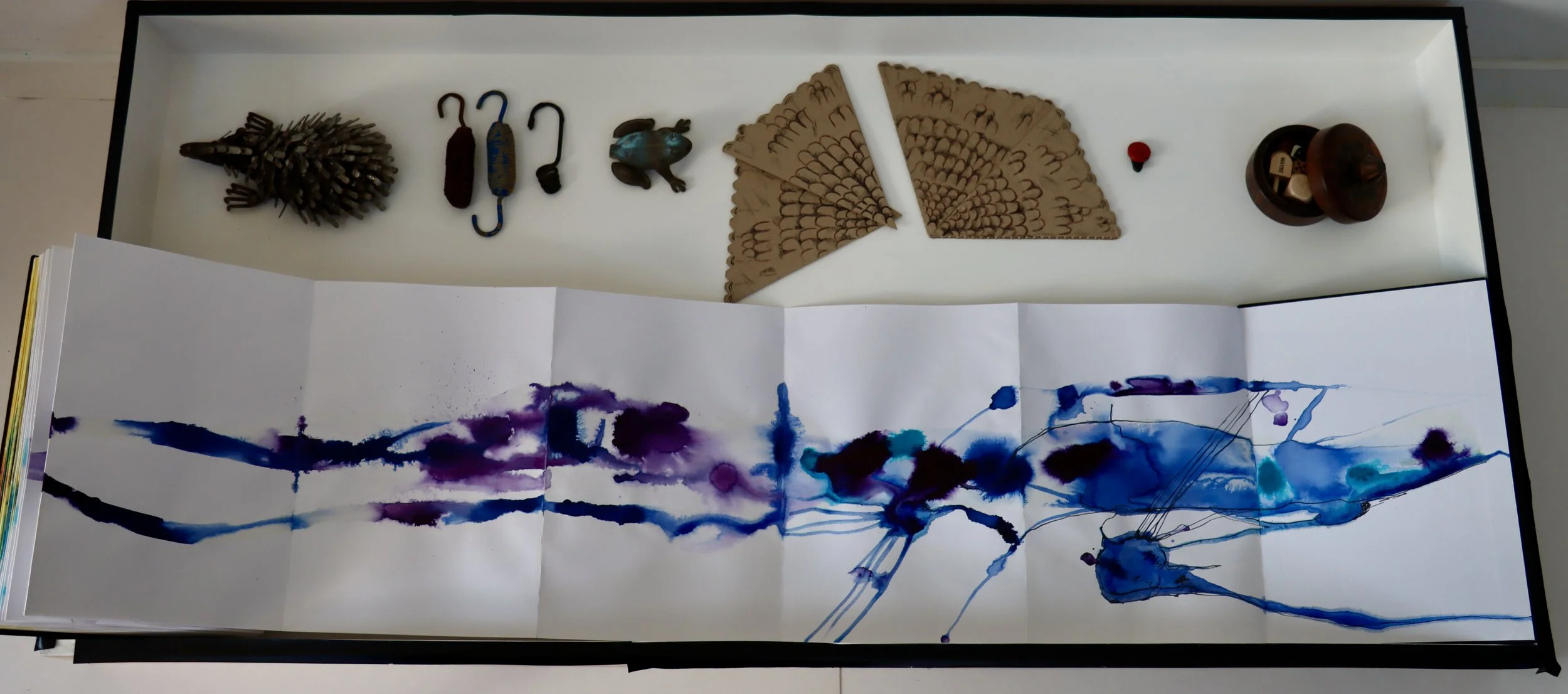 Vas Hermeticum: Between the Imaginal and the Real brings together a concertina sketchbook and a constellation of found objects within an intimate, contained display. The concertina, one of six developed in the last 2 years, operates as a site of psychic encounter, where painting, staining, and mark-making become processes of dialogic engagement with emerging imagery. Informed by alchemical thinking, the sketchbook functions as a vas Hermeticum—a sealed vessel in which traces of the psyche form and unfold through material practice, reflective attention, and the dynamics of projectio.