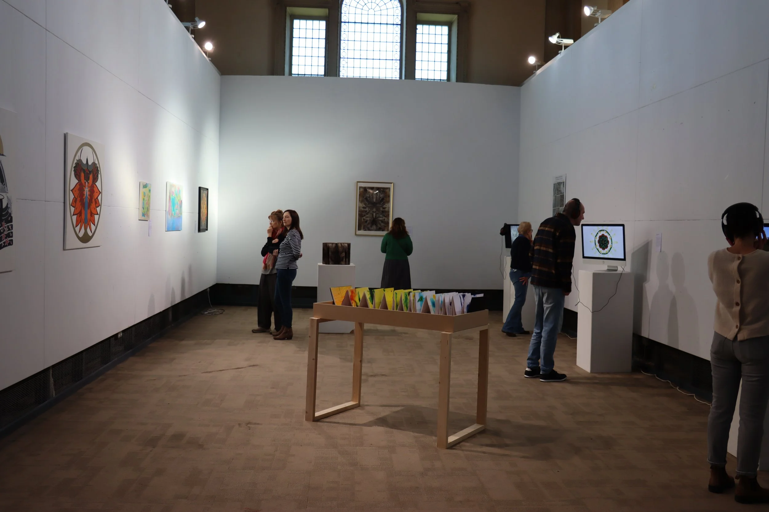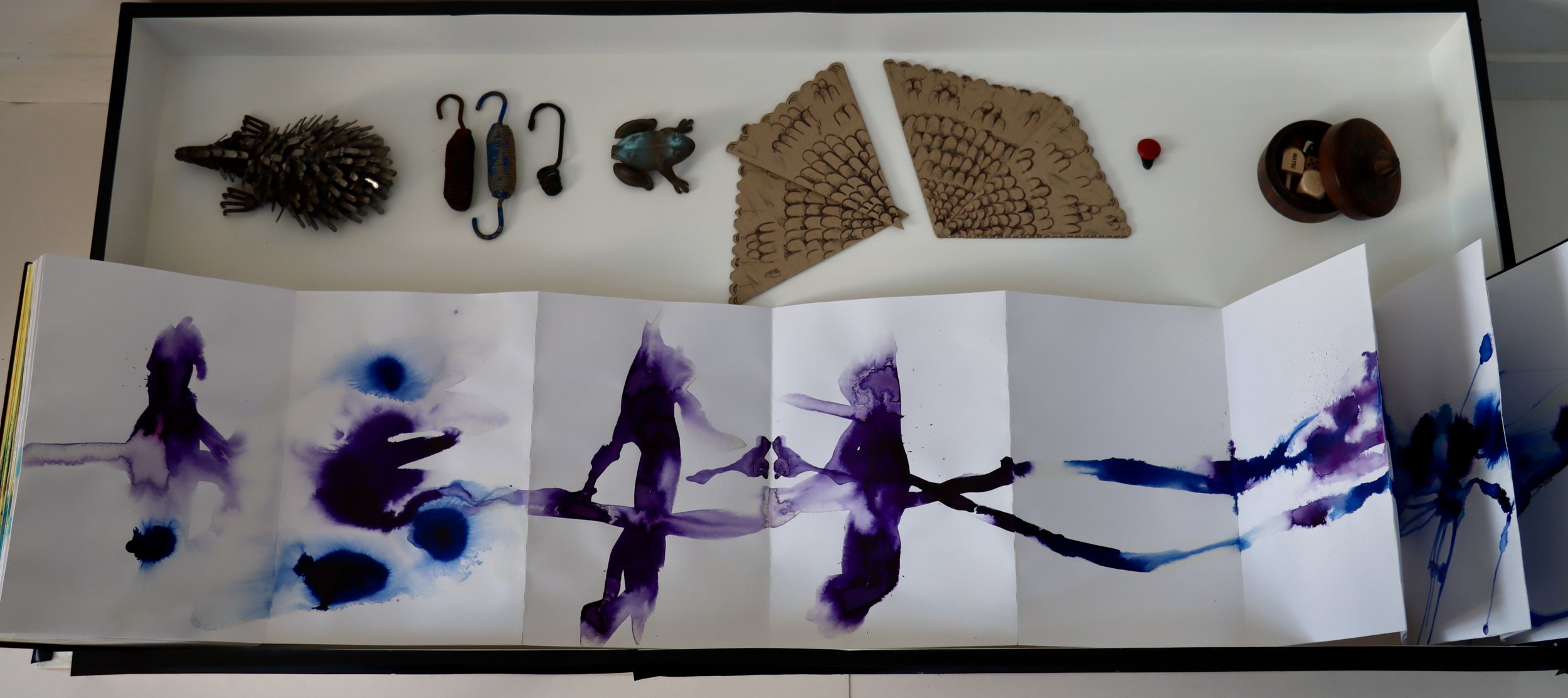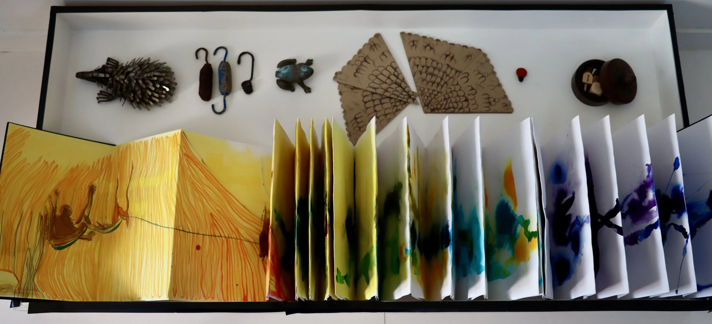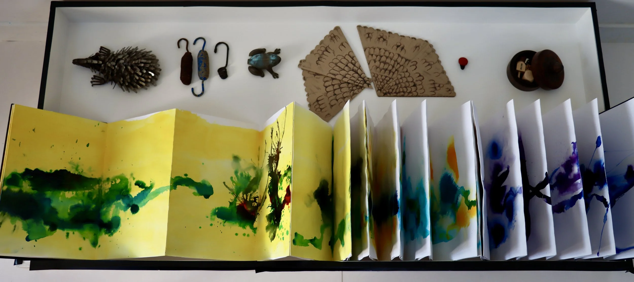 Vas Hermeticum: Between the Imaginal and the Real brings together a concertina sketchbook and a constellation of found objects within an intimate, contained display. The concertina, one of six developed in the last 2 years, operates as a site of psychic encounter, where painting, staining, and mark-making become processes of dialogic engagement with emerging imagery. Informed by alchemical thinking, the sketchbook functions as a vas Hermeticum—a sealed vessel in which traces of the psyche form and unfold through material practice, reflective attention, and the dynamics of projectio.