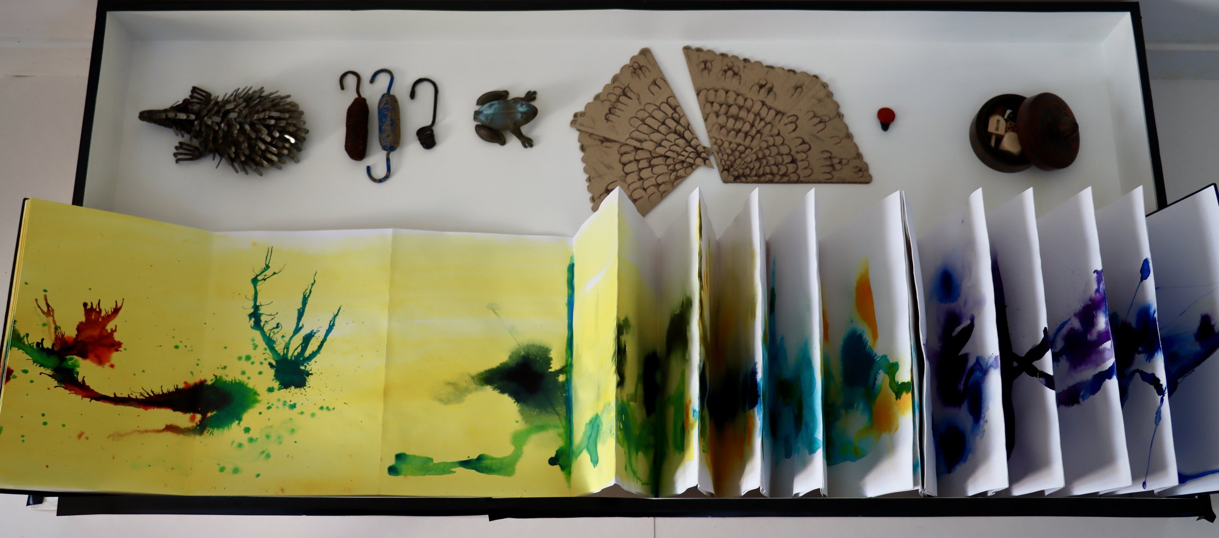 Concertina Sketch book with pencil, ink, watercolour, acrylic, collage paper covered in Dorland’s Wax Medium. With selected found objects from personal collection.